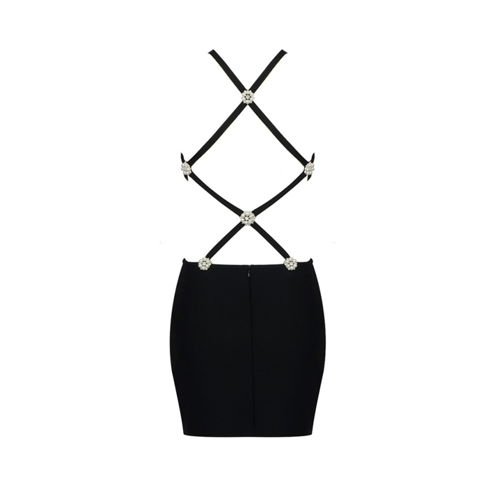 - Sexy and elegant mini black dress with a pearl crystal buckle backless design and cut-out detailing